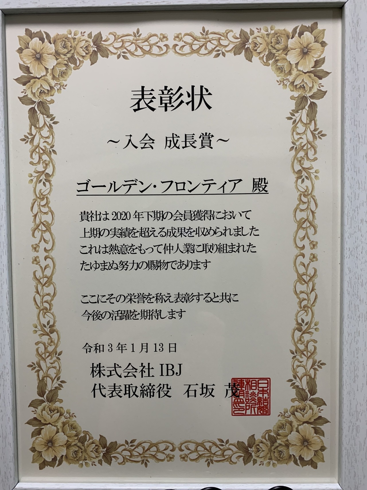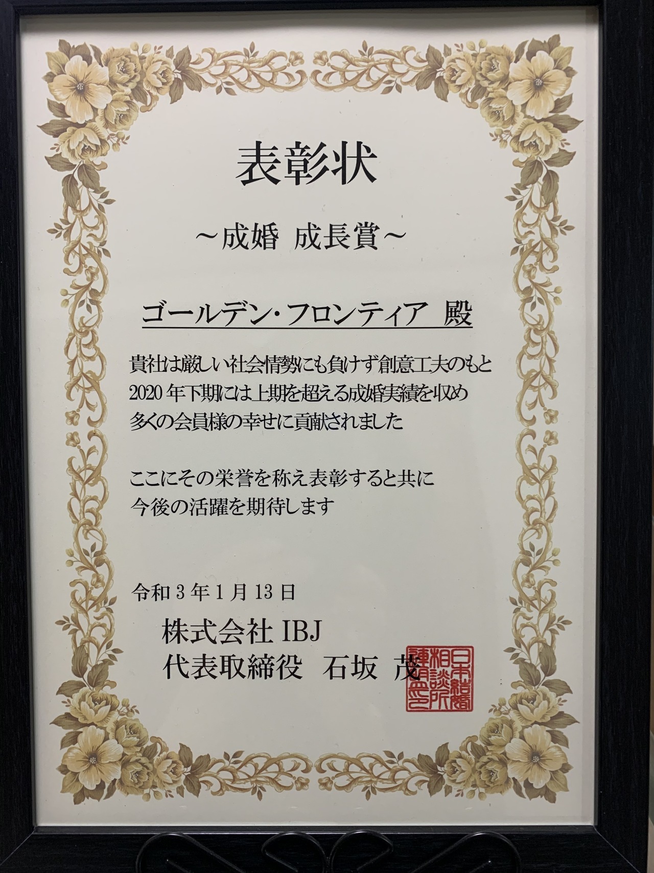 入会・成婚実績・地域貢献・クレーム状況などすべての基準を満たした加盟店が頂けるものです。会員の皆様、無料相談の初見で私を信じてくださった皆様、IBJの仲間の皆様のおかげで頂くことが出来ました。